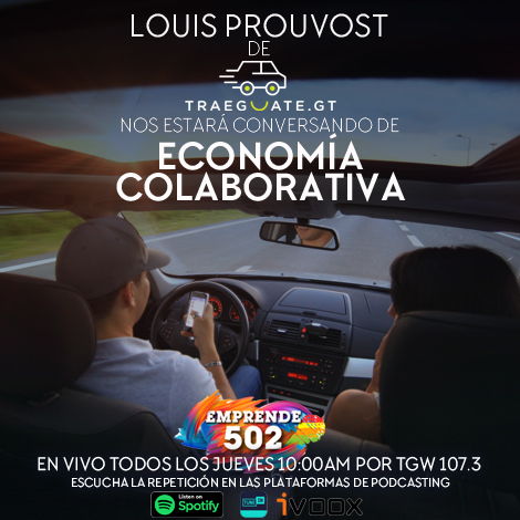 En la emisión #21 de Emprende502 conversamos con Louis Prouvost de Traeguate acerca de Economía Colaborativa, también nos explica de su propuesta para solucionar el problema del tráfico por medio de la primer plataforma de Carpooling en Guatemala.